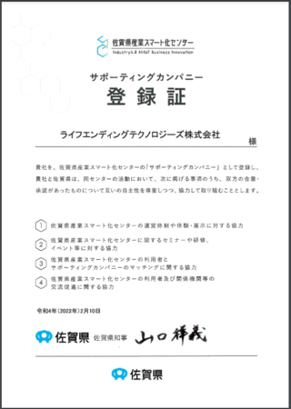 葬儀DXを推進するライフエンディングテクノロジーズ株式会社(本社:東京都港区、代表取締役:白石和也、以下「当社」)は、佐賀県スマート産業センターのサポーティングカンパニーに登録されました。当社がサテライトオフィスを置く佐賀県の事業者様のDX推進に寄与して参ります。