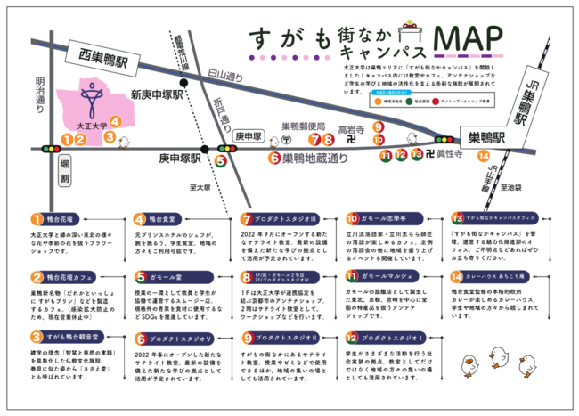 ※4 「すがもオールキャンパス構想」を掲げる本学は、巣鴨駅から大正大学までのエリアに「すがも街なかキャンパス」を開設。協働する巣鴨の3商店街沿いに多彩な施設を展開し、学生が地域・企業と連携しながら実践的な学びを深める場となることを目指しています。