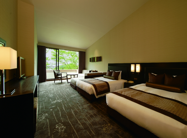 落ち着いた色調と設えで、窓から望む豊かな自然が一枚の絵のように美しく、心からゆっくりと寛ぐことのできるお部屋は、洋室から和洋室までご用意しています。39室だけの隠れ家のような館内には屋内プールや露天風呂付温泉大浴場が、敷地内にはテニスコートもあり、静と動それぞれの時間をご自身のペースでお楽しみいただけます。