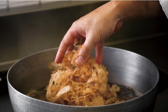 静岡県網代「丸藤」の鰹節は、上質な鰹節だけを仕入れ、原料の状態や季節によって削りの厚さを調整するなど、その丁寧な仕事が全国の料理人達から高い評価を受けています。この丸藤の鰹節をやや硬度の高い箱根の水で引き、雑味のない上品な出汁に仕上げます。食品の持ち味と合わせることで、上品かつ伝統的でありながら温かみと懐かしさを感じる逸品へと作り上げています。