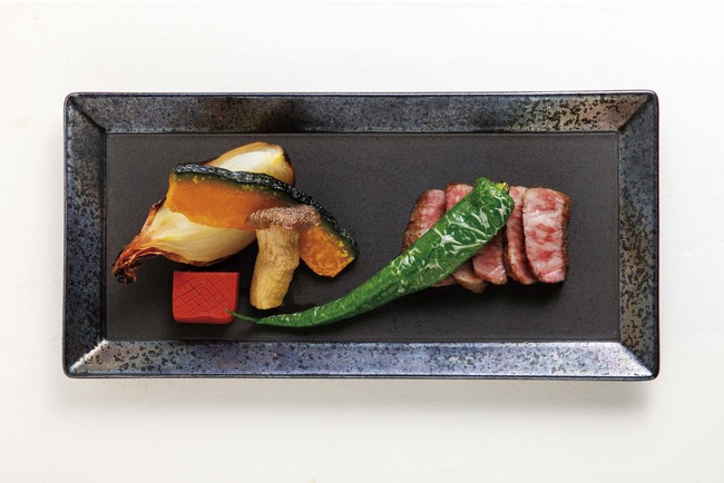 メイン料理には脂の乗った和牛サーロインが、ほくほくの南瓜やじっくりと火を入れ甘く仕上げた玉ねぎの野菜と共に登場します。口解けのよい和牛の脂と、野菜の旨味の相性の良さをお楽しみください。