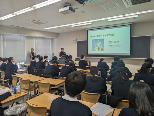 1週目は田中研之輔教授と有山徹さんに学校にお越しいただき、プロティアン・キャリアに関するお話をしていただきました。そして2週目はプロティアン・キャリア協会教育ラボチーム17名の方に高3生との対話をしていただきました。