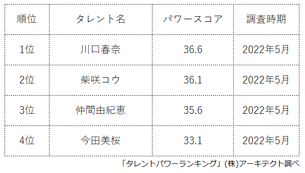 本ランキングは、2022年5月度に実施したタレント調査データ(一部過去実施データ)を利用し、タイトルに応じてランキング形式でまとめたものです。