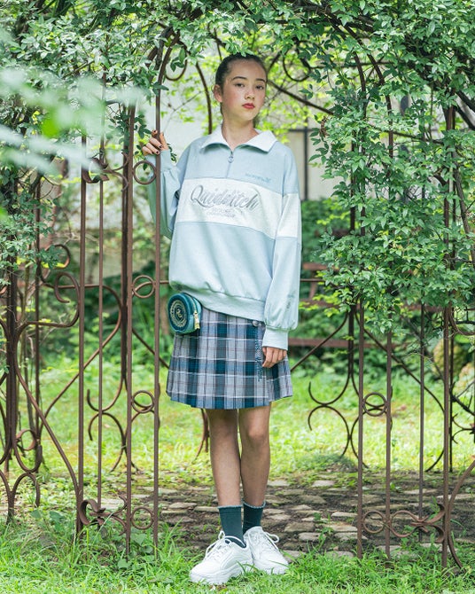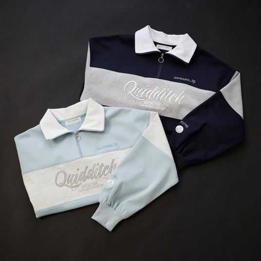 ハーフジップトップストレンドのハーフジップデザインのカットソーに、『ハリーポッター』の世界で大人気のスポーツ、「クィディッチ」モチーフのデザインを施しました。ロゴ刺繍の下には箒のシルエットが。袖口にはホグワーツのマークの刺繍入り。