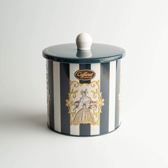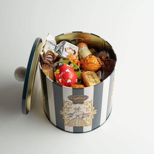 詳細:カファレルらしいストライプにヴィクトリアンファッションを身にまとい、カファレルのチョコレートを楽しむ貴婦人がクラシカルな雰囲気を引き立てます。持ち手がついたポット缶に加え、ネイビーのストライプ地にも同系色のゴシック模様を配置した拘りのデザイン缶です。人気のジャンドゥーヤに加え、クレミノキューブやダークオレンジ、ソルテッドキャラメルにてんとう虫のホイルチョコレートなど26粒をアソート。自分へのご褒美としてもギフトとしても大変おすすめです。
