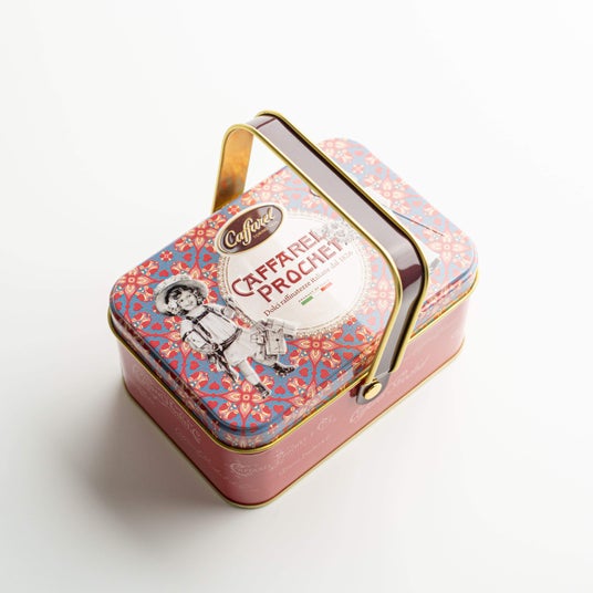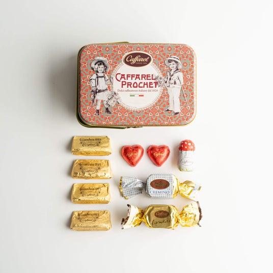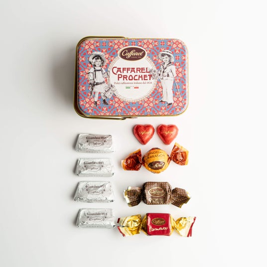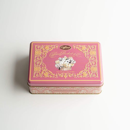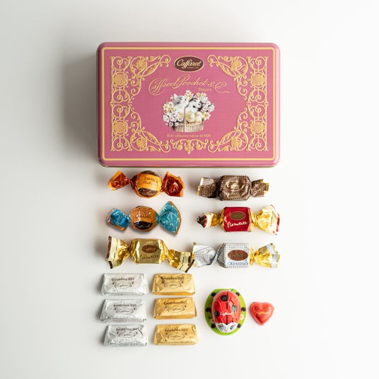 詳細:ローズピンクをベースとした缶に、愛らしい表情の子猫やひよこたちが、花々と一緒に籠の中にいるシーンが描かれたキュートなデザイン缶。子猫たちの周りにはクラシカルなゴシック文様が描かれ、可愛さだけでなく、上品さも兼ね備えたデザイン缶となっています。中にはカファレルの代名詞であるジャンドゥーヤをはじめ、人気のピエモンテやクレミノキューブ、ソルテッドキャラメルなど、14粒をアソート。
