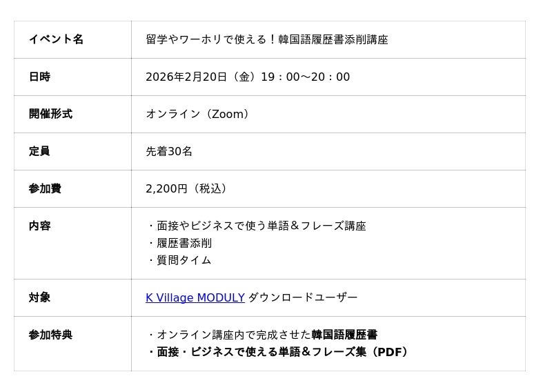 日本最大級の韓国語教室「K Village 韓国語」を運営する株式会社K Village(本社:東京都新宿区、代表取締役社長:桑原 元就)は、留学・ワーキングホリデー・韓国就職を目指す方を対象としたオンライン講座『留学やワーホリで使える!韓国語履歴書添削講座』を、2026年2月20日(金)に開催します。