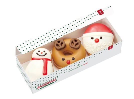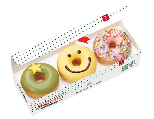 ストロベリー ミルク クリーム サンタ、キャラメル トナカイ リング、ピスタチオ クリーム ツリー、チョコレート スノーマン。人気のオリジナル・グレーズド(R)も一緒の12個入り。家族や友達と集まって、心がキラキラ輝く時間を。