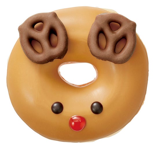 『キャラメル トナカイ リング』は、登場するたびに好評いただいているトナカイがリング型になって登場します。コクのあるキャラメル風味のコーティングをほどこしたドーナツに、チョコをまとったプレッツェルの角をつけ、つぶらな瞳をビターなチョコで描きました。チャームポイントの真っ赤な鼻は、甘酸っぱいストロベリーナパージュで仕上げています。