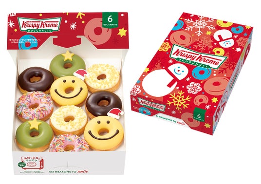 ホリデーをおいしく彩るストロベリー ミルク クリーム サンタ、キャラメル トナカイ リング、ピスタチオ クリーム ツリー、チョコレート スノーマン。人気のオリジナル・グレーズド(R)も一緒の6個入り。スイートな笑顔あふれる楽しいホリデーを。