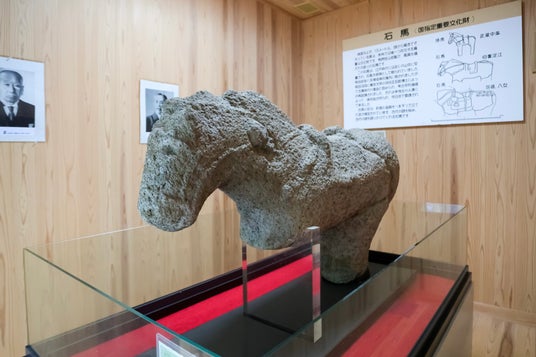 馬取県の馬の名所を代表する象徴的存在が、鳥取県米子市の天神垣(あめのかみがき)神社(米子市淀江町福岡1016)に伝わる「石馬(いしうま)」です。江戸時代のころには「石馬大明神」として祀られていました。石馬は、石製の馬形埴輪として出土したものとして全国で唯一、国の重要文化財に指定されており、同神社境内の収蔵庫に収められています。