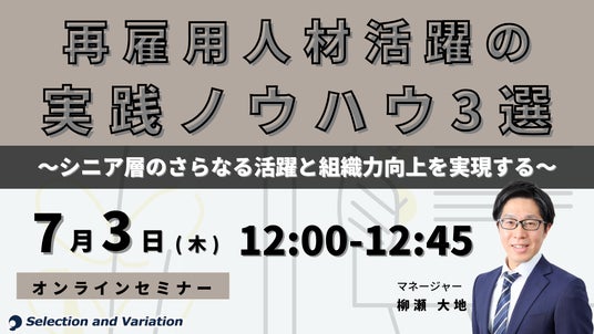 組織・人事コンサルティングファームであるセレクションアンドバリエーション株式会社(以下、当社、東京都千代田区丸の内、大阪市西区、名古屋市西区 / 代表取締役社長:平康慶浩/ URL:https://sele-vari.co.jp/ )は『再雇用人材活躍の実践ノウハウ3選 ~シニア層のさらなる活躍と組織力向上を実現する~』セミナーを2025年7月3日(木)12:00~12:45に開催することをお知らせいたします。