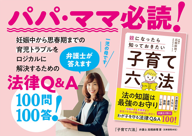 高橋麻理弁護士、初の書籍となる『子育て六法』(日東書院本社/辰巳出版グループ)が8月19日に発売。子育てでありがちなトラブルから、できれば起きてほしくない深刻な問題まで、100の質問に法的観点で回答する。わが子を犯罪の被害者にも加害者にもさせないために、親が知っておくべき法律の知識を網羅した、全保護者必読の書。