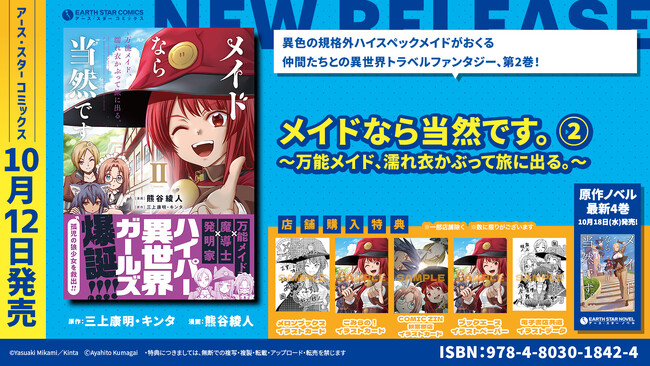 アース・スターノベルにて刊行中のノベルが原作で、現在コミック アース・スター公式サイトにて連載中の人気作品『メイドなら当然です。~万能メイド、濡れ衣かぶって旅に出る。~』(原作:三上康明・キンタ 漫画:熊谷綾人)第2巻を10月12日(木)に発売いたします。