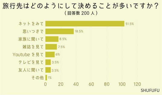旅行先はどのようにして決めることが多いかを尋ねたところ、1位は「ネットをみて(51.5%)」、2位「思いつきで(18.5%)」となりました。SNSで誰かが旅行に行っている写真を見たり、おすすめの観光スポットが紹介されているとつい行きたくなりますよね。