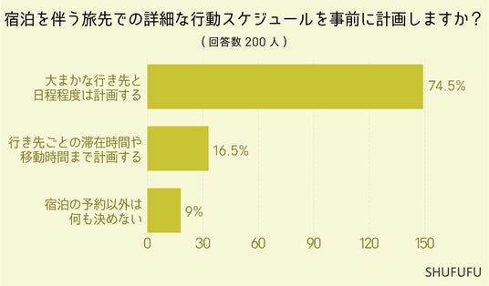 宿泊を伴う旅先での詳細な行動スケジュールを事前に計画するかを尋ねたところ、1位は「大まかな行き先と日程程度は計画する(74.5%)」、2位「行き先ごとの滞在時間や移動時間まで計画する(16.5%)」となりました。細かくスケジュールを組む方より、大まかなスケジュールだけ考えるという方が圧倒的に多かったです。タイトスケジュールだと融通が利かない場合がありますからね。