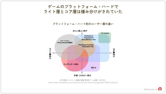 もともと、ゲームプレイヤーのライト層とコア層は、ゲームのプラットフォームとハードによってある程度の棲み分けがされていました。「みずほ銀行 コンテンツ産業の展望 第5章 ゲーム産業」にて紹介された上図がこのことを分かりやすく図解しています。