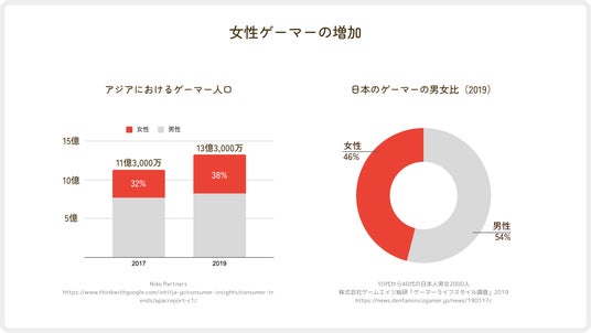 アメリカの市場調査/コンサル会社のNiko Partnersによる2020年の調査によると、アジアでは近年女性ゲーマーの増加率が特に著しく、2017年から2019年にかけて18.8%増加。2019 年末には、女性ゲーマーはプラットフォーム全体で5億人まで増加し、これはアジアの総ゲーム人口の38%を占めるとのことです。