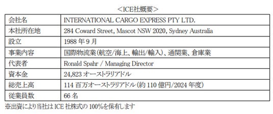 阪急阪神エクスプレス(本社:大阪市北区 代表取締役社長:谷村 和宏)は、オーストラリア連邦のフォワーダー「INTERNATIONAL CARGO EXPRESS PTY LTD.」(本社:シドニー 以下、ICE社)の全株式を取得し、子会社とします。
