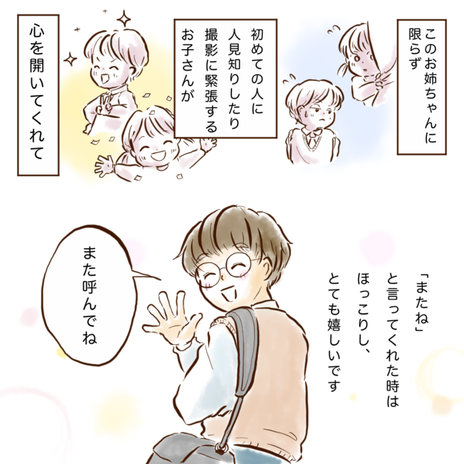撮影後、佐藤フォトグラファーが後片付けをしているとお姉ちゃんが側までやってきて、小さい声で可愛いお願いをしてくれたそうです。はじめは人見知りしていたお姉ちゃんですが、撮影の間に佐藤フォトグラファーと仲良くなって、心の距離が縮まった様子が伺えます。