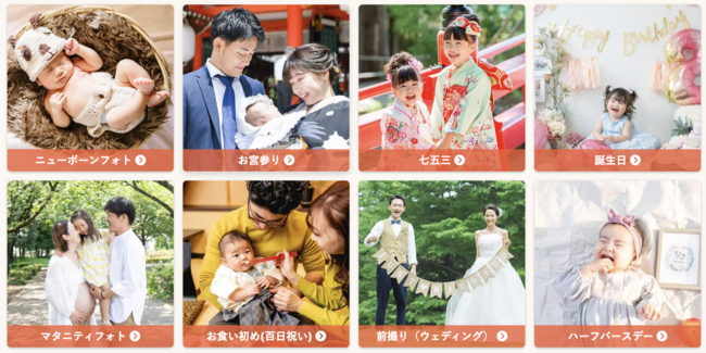 シンプルな料金設計と、好きな場所に好きなフォトグラファーを指名して撮影予約ができるのが特徴。マタニティ、ニューボーン(新生児)、お宮参り、誕生日、七五三、卒入園・卒入学、成人式、結婚式の前撮り・後撮り、長寿祝いなど、ご家族の記念日に寄り添う「我が家の専属カメラマン」として、全国のご家族にご利用いただいています。