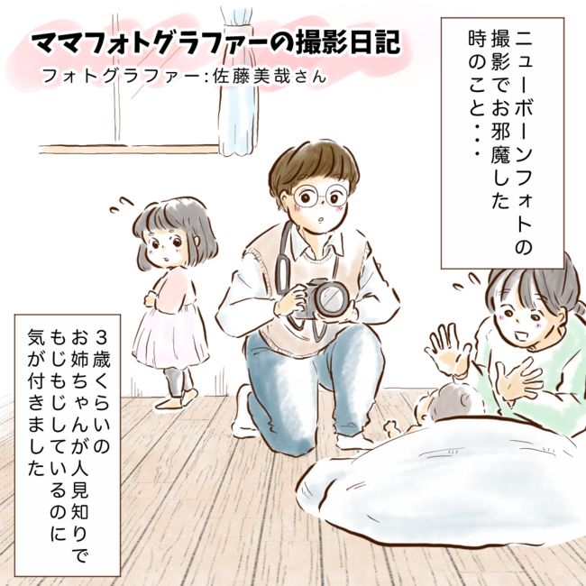 今回漫画にしていただいたのは、fotowaに登録しているママフォトグラファー・佐藤美哉さん( https://fotowa.com/photographers/funwari-miya )の体験です。ニューボーンフォトの撮影で訪れたご家庭で、3歳くらいのお姉ちゃんとの可愛らしいやりとりにほっこりします。