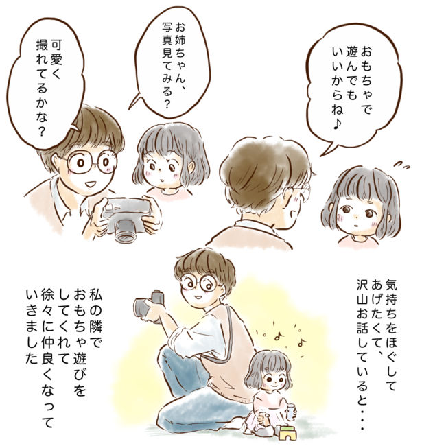 佐藤フォトグラファーが、ニューボーンフォトの撮影をしていると、横で3歳くらいのお姉ちゃんがもじもじしていました。ニューボーンフォトはご家族にとって、リラックスしてゆっくり赤ちゃんに向き合える大切な時間です。フォトグラファーはご家族をよく見て、撮影の時間を気持ちよく過ごせるように心配りをします。人見知りしているお姉ちゃんの気持ちを感じ取った佐藤フォトグラファーは、優しく声をかけていきました。すると、段々と気持ちがほぐれてきたお姉ちゃん。安心して心を開いてもらえたようで、佐藤フォトグラファーの隣で遊びはじめたそうです。