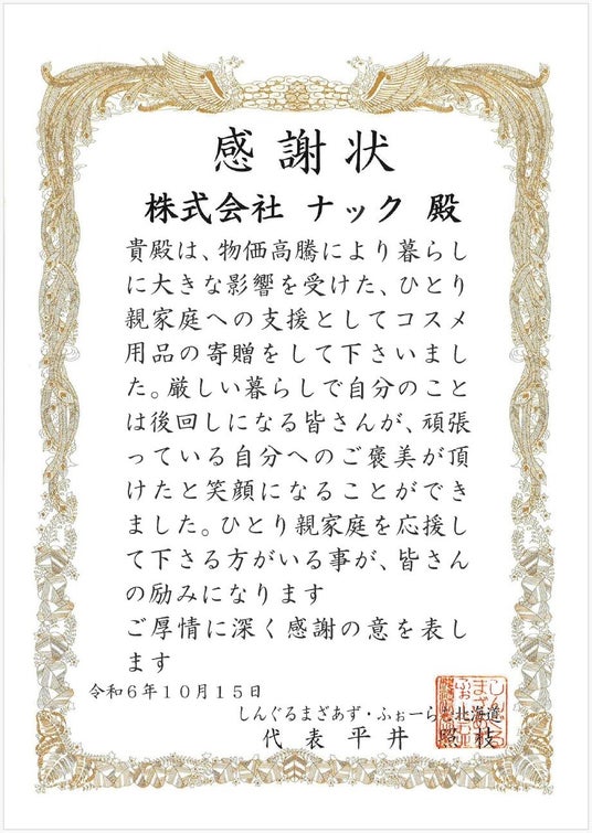 株式会社ナック (本社:東京都新宿区、代表取締役社長:吉村 寛)は、こども家庭庁などが推進する「こどもの未来応援国民運動」への協力の一環として、2024年発送分の株主優待品(当社グループで展開する化粧品ブランド「MACCHIA LABEL(マキアレイベル)」の商品)の予備分※を、こども家庭庁を通じて、「しんぐるまざあず・ふぉーらむ北海道」に寄贈しました。