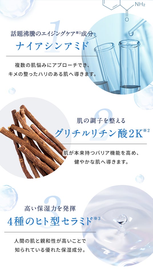 ※3 医薬部外品の場合はヒドロキシステアリルフィトスフィンゴシン、ステアロイルオキシヘプタコサノイルフィトスフィンゴシン、N-ステアロイルジヒドロスフィンゴシン、N-ステアロイルフィトスフィンゴシン