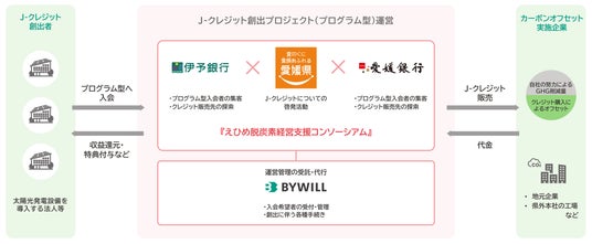 バイウィルはプログラム型プロジェクトの運営、J-クレジット創出手続き、J-クレジット販売先の探索を代行する予定です。バイウィルが都道府県と連携協定を締結するのは、愛媛県が初めてです。