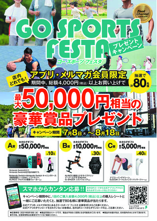 「Go Sports Festa ~ゴー スポーツ フェスタ~」は、店内商品総額¥4,000(税込)以上お買い上げのアプリ・メルマガ会員様の中から、抽選で80名様に、ご家族でも、おひとりでも、気軽にスポーツを楽しむためのアイテムがきっと見つかるWEBカタログギフトをプレゼントいたします。
