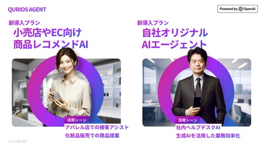 AIやXR等の先端技術で社会課題の解決に取り組む株式会社ワントゥーテン(本社:京都府京都市、代表:澤邊芳明)は、働く人をアシストするAIエージェント「QURIOS AGENT(キュリオス・エージェント)」に、新たな導入プラン「商品レコメンドAIエージェント」と「自社オリジナルAIエージェント」を追加し、QURIOS AGENT公式サイトの問い合わせフォームより受注受付を開始しました。