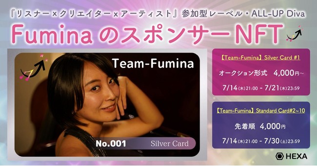 株式会社フォーイットと資本業務提携を締結したメディアエクイティ株式会社(本社:東京都品川区、代表取締役 椛島 誠一郎、以下「メディアエクイティ社」)は、クリエイター・コンテンツホルダー等のさまざまなステークホルダーとの共創によるNFTの普及と発展を目的に、『ALL-UP Diva』のアーティスト「Fumina」 のファンカードスポンサーNFTをセカンドセールとして7月14日(木)21:00~から開始いたします。