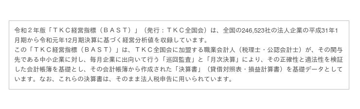 3.「TKC経営指標(BAST)」の内容を論文等で引用又は参照する場合は、説明文として下記の文章を必ずご利用ください。