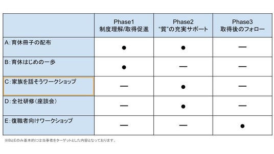 そこで、「とるだけ育休※」を防ぎ、育休の質を向上させることで、復帰後も希望する形で仕事と家庭を両立しながら活躍できるよう、男性育休サポートプログラムの「家族を話そうワークショップ(当事者向け)」を提供することとなりました。