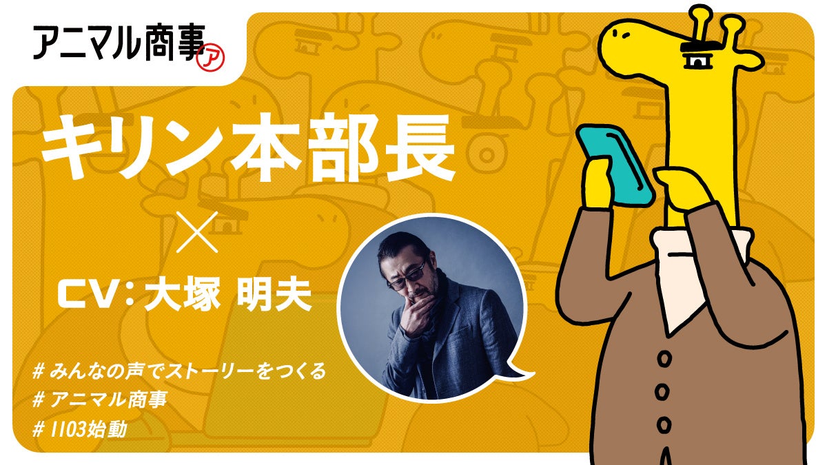 本作では、アニメファンにもおなじみの豪華声優陣にキャラクターを演じていただきました。配信開始に先駆け、大塚明夫氏が演じる「キリン本部長」と、春瀬なつみ氏が演じる「サメ課長」「ナレーター」、木田祐氏が演じる「ライオン課長」「ゴリラ課長」のキャラクタービジュアルを公開いたします。