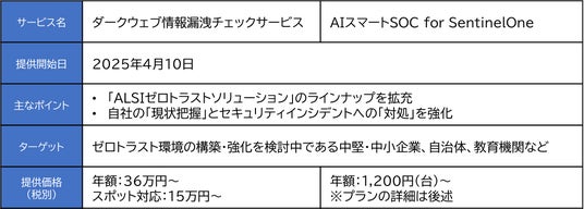 アルプス システム インテグレーション株式会社(本社:東京都大田区、代表取締役社長:永倉 仁哉、以下ALSI〔アルシー〕)は、 「ALSIゼロトラストソリューション(アルシーゼロトラストソリューション)」のラインナップに、ダークウェブへの情報漏洩を調査する「ダークウェブ情報漏洩チェックサービス」 およびEDRの運用を支援する 「AIスマートSOC for SentinelOne(エーアイスマートソックフォーセンチネルワン)」を新たに追加し、4月10日に提供開始いたします。これにより、自社の「現状把握」とセキュリティインシデントへの「対処」を強化し、自社の状況や課題に合わせたゼロトラスト環境の構築を支援いたします。