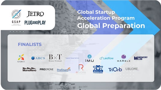 Plug and Play Japan株式会社(本社:東京都渋谷区、代表取締役社長:ヴィンセント・フィリップ、以下「Plug and Play Japan」)は、独立行政法人日本貿易振興機構(東京都港区、理事長:石黒 憲彦、以下「JETRO」)との連携によるスタートアップ向け海外展開支援プログラム「Global Startup Acceleration Program(GSAP)※『Global Preparationコース』」のファイナリスト15社を決定したことをお知らせいたします。
