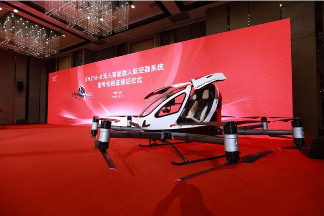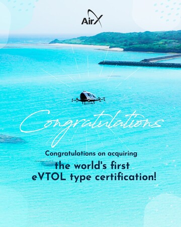 ヘリコプターやプライベートジェット、空飛ぶクルマなど、次世代のエアモビリティの供給源となるインフラを構築する株式会社AirX(本社:東京都千代田区、代表取締役:手塚 究、以下「AirX」)は、パートナー企業であるEHang社が、中国で空飛ぶクルマ「EH216-S」の型式証明を、中国民用航空局(CAAC)から正式に取得完了したことをお知らせいたします。無人電動垂直離着陸機(eVTOL)の型式証明の取得は、世界で初めて(*) となります。