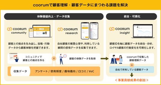 「coorum(コーラム)」は、コミュニティを活用して顧客のロイヤリティを高めLTV最大化を実現する「coorum community(コーラムコミュニティ)」、顧客単位で行動データを統合・可視化することで、顧客の“変化”をリアルタイムに捉える「coorum insight(コーラムインサイト)」、顧客の本音を収集し顧客理解を深めるリサーチツール「coorum research(コーラムリサーチ)」の3つのプロダクトからなるロイヤル顧客プラットフォームです。マーケティング・PR・商品開発など事業の意思決定にお客様の声や心理・行動データを反映することで事業成長を支援します。