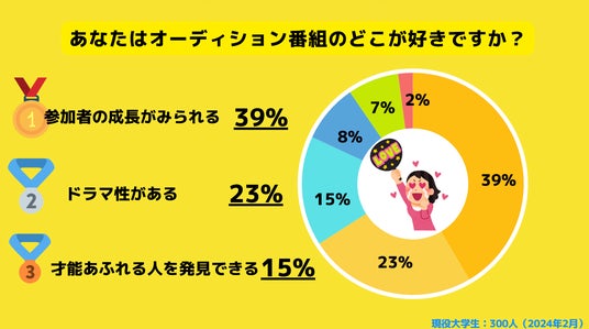 参加者の成長がみられるから39%、ドラマ性があるから23%、才能あふれる人を発見できる15%、友達と共通の話題ができるからが8%、投票や推し活の楽しさ7%、審査員のコメントが面白いと回答した人は2%でした。