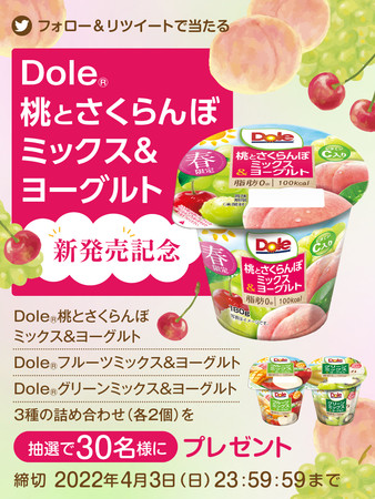 「Dole(R)桃とさくらんぼミックス&ヨーグルト」の発売を記念して、「Dole(R)桃とさくらんぼミックス&ヨーグルト」「Dole(R)フルーツミックス&ヨーグルト」「Dole(R)グリーンミックス&ヨーグルト」の3種詰め合わせ(各2個ずつ)が抽選で30名様に当たるTwitterキャンペーンを実施いたします。