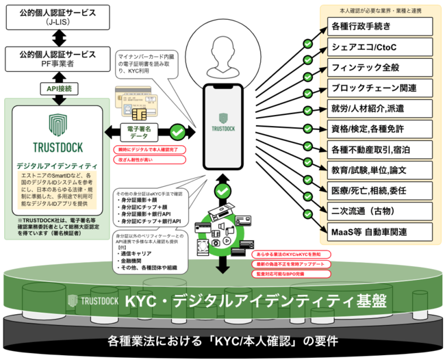 株式会社TRUSTDOCKは、マイナンバーカードの公的個人認証をはじめ、犯罪収益移転防止法のeKYCが可能なデジタル身分証アプリと、あらゆる業法に対応するKYCのAPI基盤サービスを提供する、日本で唯一のKYCの専門会社です。eKYC/KYC導入社数No.1(※1)のリーディングカンパニーとして、外部の有識者による「デジタル社会の本人確認に関するアドバイザリーボード(※2)」を設置するなど、国内外を問わず、デジタルアイデンティティ&eKYC基盤の構築に向けて安心・安全なデジタル社会のインフラ構築を推進しています。