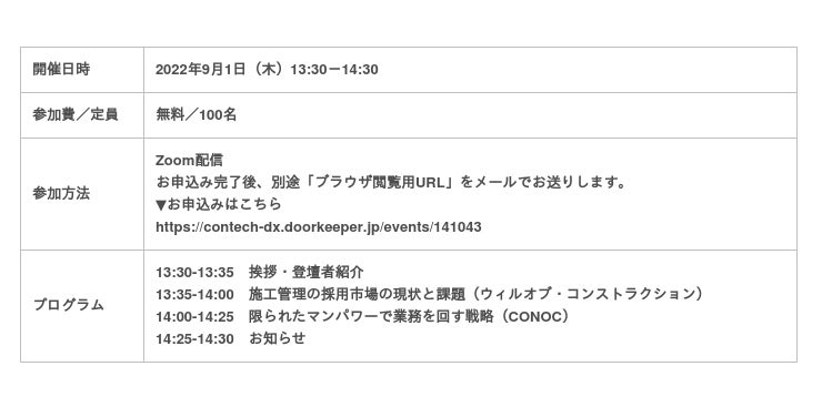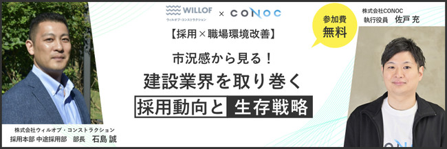 ウィルグループの建設業界に特化した人材サービスを展開する株式会社ウィルオブ・コンストラクション(本社:東京都新宿区、代表取締役社長:角 裕一)は、建設業特化型のクラウドサービスを提供する株式会社CONOC(本社:東京都渋谷区、代表取締役社長:山口 一)と共催で、無料オンラインセミナー『【採用×職場環境改善】市況感から見る!建設業界を取り巻く採用動向と生存戦略』を、2022年9月1日(木)に開催します。