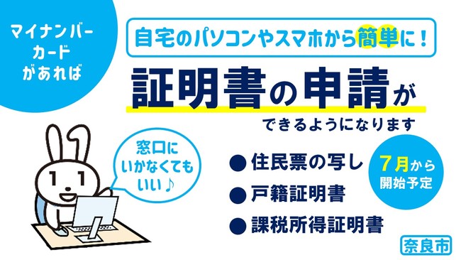 まずは、令和4年7月に証明書インターネット申請の開始予定。マイナンバーカードを利用して、自宅から証明書(住民票・戸籍証明書・課税所得証明書)をオンラインで申請すると証明書は自宅に郵送します。