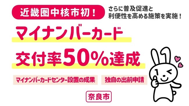 その結果、奈良市では、この度、近畿圏の中核市で初めてマイナンバーカードの交付率50%を達成しました。今後も普及促進に向けた取り組みを行うとともに、カード取得者に対するメリットを提示し、利便性を高める施策についても実施していきます。