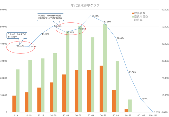 60~70歳の取得率が高く、10~19歳、39~59歳の取得率がやや低い状況です。これは全国的なデータとも一致しています。このデータに基づき、本市では特に普及率が低い若年層とその親世代を、啓発のメインターゲットとして取り組みます。