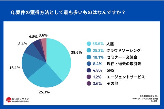 「Q.案件の獲得方法として最も多いものはなんですか?」(n=83)と質問したところ、「人脈」と回答した方が最多(38.6%)となりました。「クラウドソーシング」という回答も25.3%ありました。