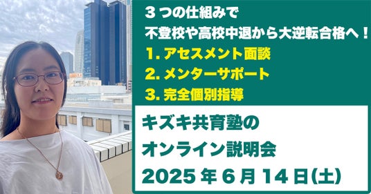 株式会社キズキ(本社:東京都渋谷区、代表取締役社長:安田祐輔)が運営する完全個別指導塾「キズキ共育塾」は、2025年6月14日(土)に「不登校・高校中退・通信制高校などからの大逆転合格を可能にする3つの仕組み」を紹介する無料オンライン説明会を開催します。
