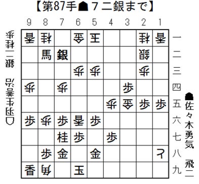 ▲5八金 △1八と ▲7二銀 まで87手で先手の勝ち